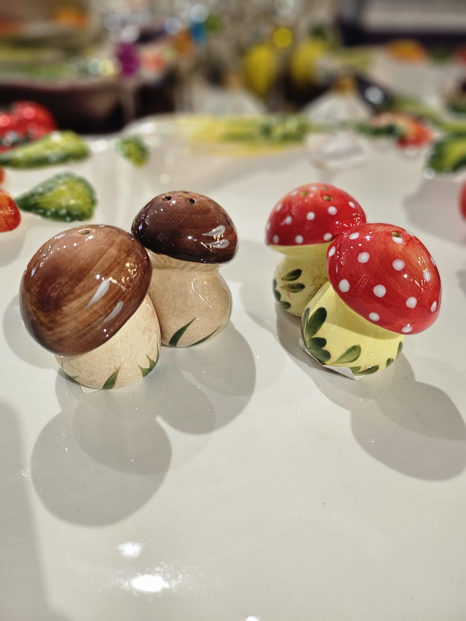 Izsmalcināts sāls un pipara trauciņu pāris mušmiru dizainā, kas piešķirs jūsu galdam rotaļīgu un elegantu akcentu. Trauciņi darināti Itālijā no kvalitatīvas keramikas un katrs no tiem ir roku gleznojums – tas nozīmē, ka katrs priekšmets ir unikāls un var nedaudz atšķirties no attēlā redzamā.