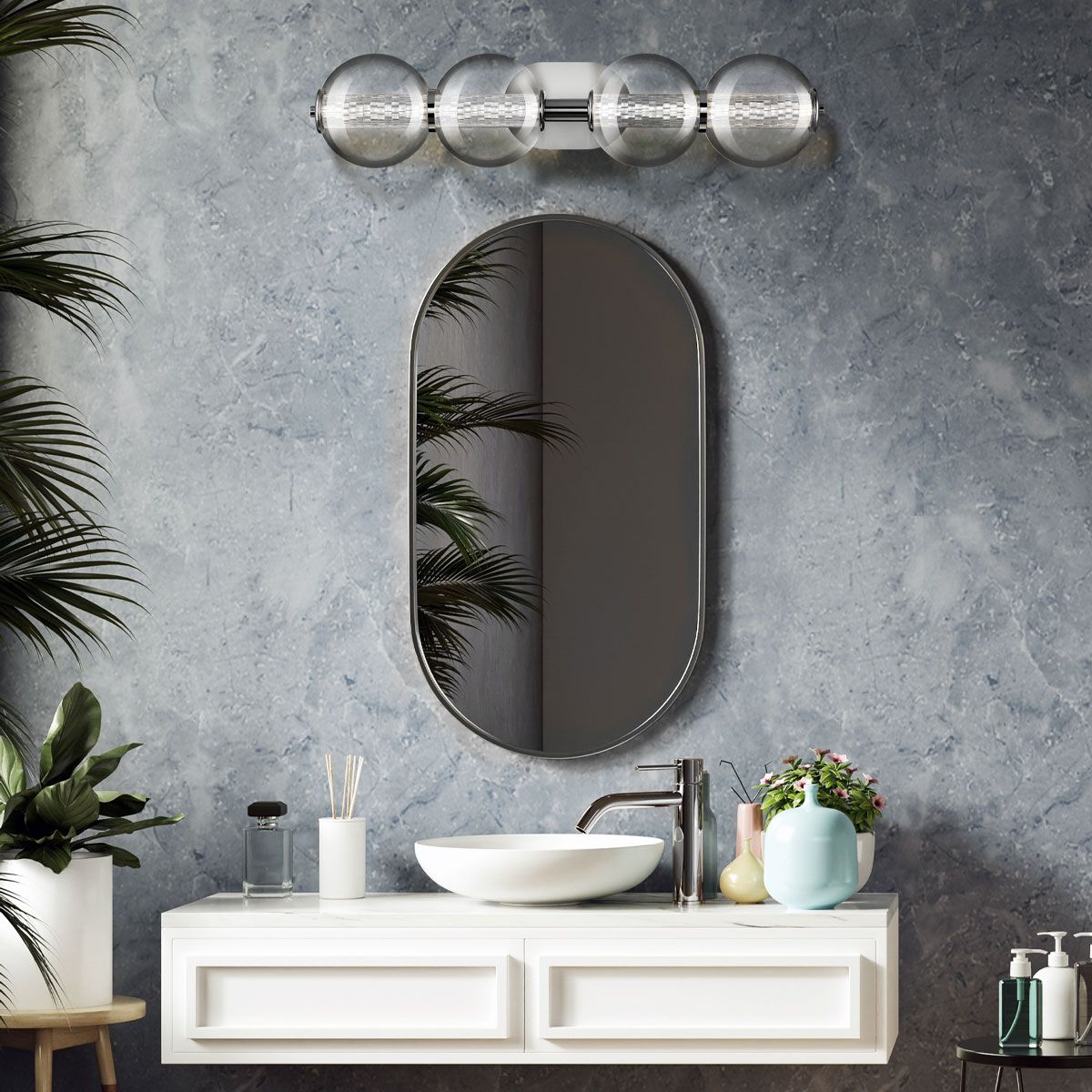 Lampas dizains ļauj tās izmantot arī vannas istabās, saglabājot estētiku un funkcionalitāti.