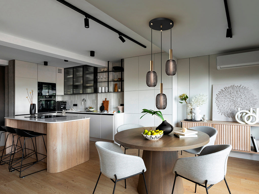 Izteiksmīga LED lampa ar četriem gaismas avotiem, izgatavota no metāla spilgti zelta un melnas vai hromēta metāla apdares. Divkāršs abažūrs ar iekšējo akrila cilindru ar burbuļu efektu un ārējo metāla sieta ovālu melnā krāsā.