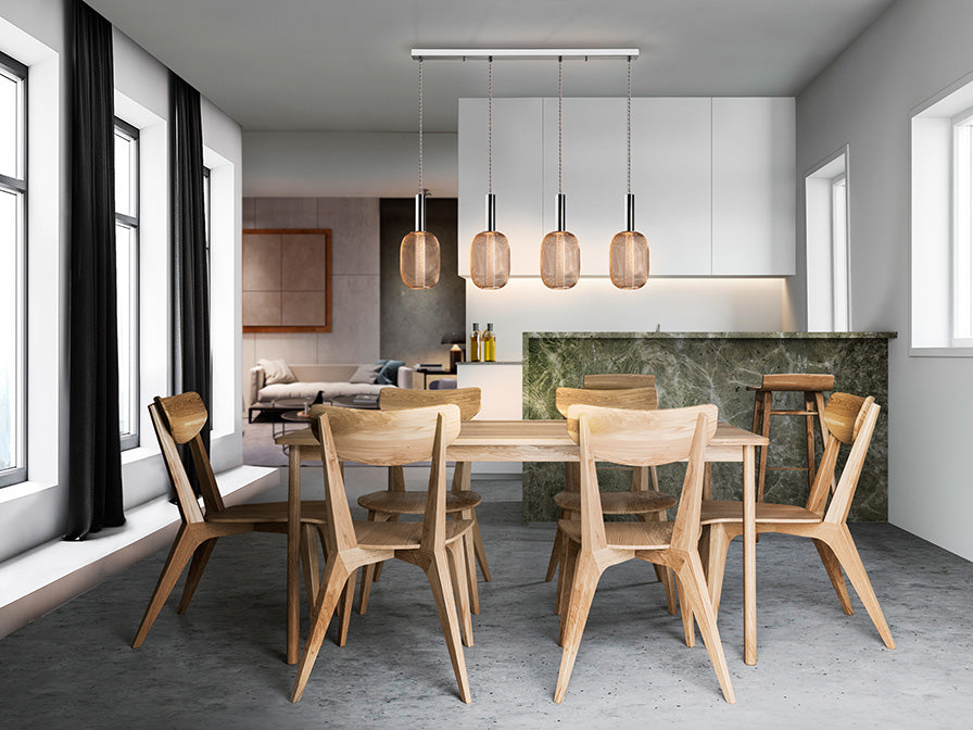 Stilīga LED lampa ar trim gaismas avotiem, izgatavota no hromēta metāla zelta vai spilgti zelta un melnas apdares. Divkāršs abažūrs ar iekšējo akrila cilindru ar burbuļu efektu un ārējo metāla sieta ovālu spilgti zelta krāsā.